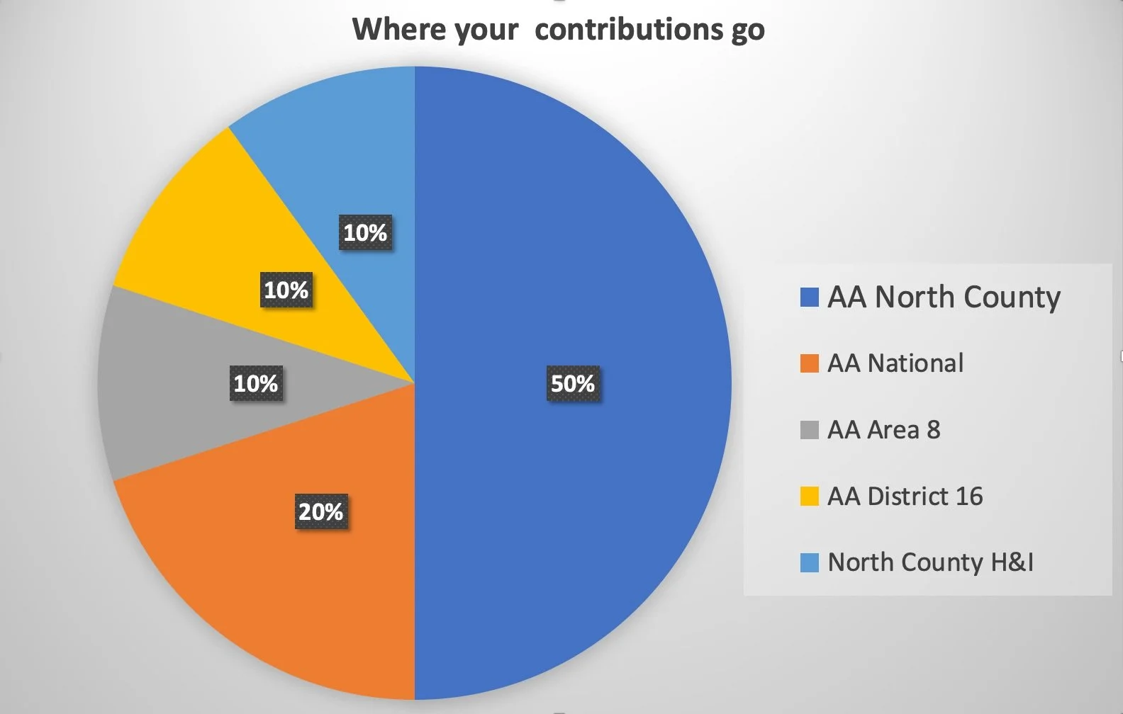 What we do with the money. Our meetings have created a non-profit tax-exempt 501 (c) (3) corporation to handle our financial affairs. That entity is called Third Tradition Fellowship. TTF serves a number of AA meetings in the Coastal North County San Diego area. We pay our very minimal meeting expenses, we keep a prudent financial reserve and we contribute the rest to AA organizations and projects locally, regionally, and nationally. Our members vote annually on the allocation of funds.